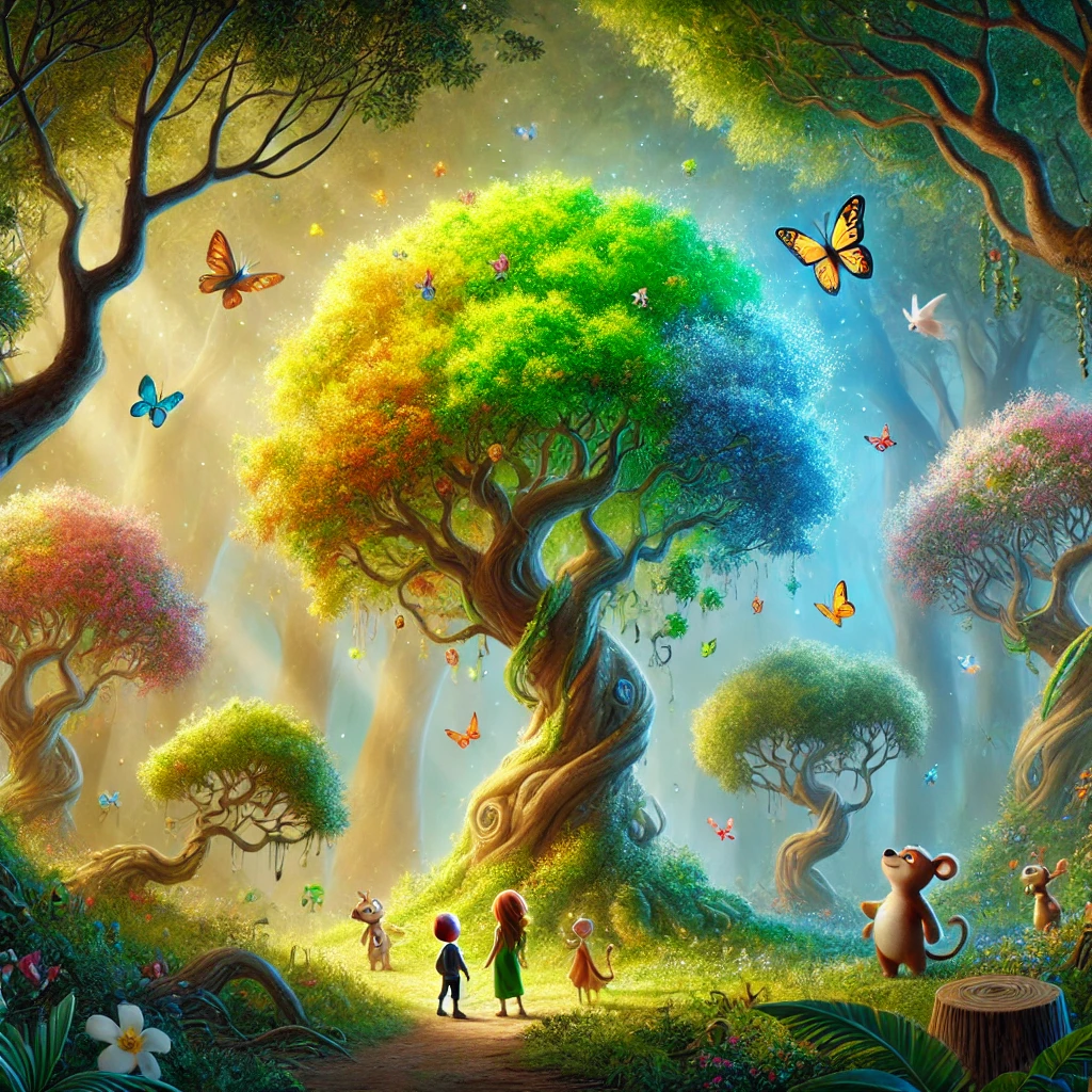 Într-o zi însorită, în mijlocul unei păduri verzi și frumoase, trăiau niște copaci cu totul speciali. Această pădure era cunoscută ca „Pădurea Veselă”, iar locuitorii săi nu erau doar copaci obișnuiți. Fiecare copac avea ceva unic, care îl făcea deosebit și prețios.